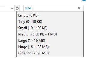 대략적인 파일 크기를 알고 있는 경우 'size:' 명령을 사용하여 결과를 필터링할 수 있습니다. 특정 크기에 대해 다음과 같은 빠른 명령을 사용할 수 있습니다.