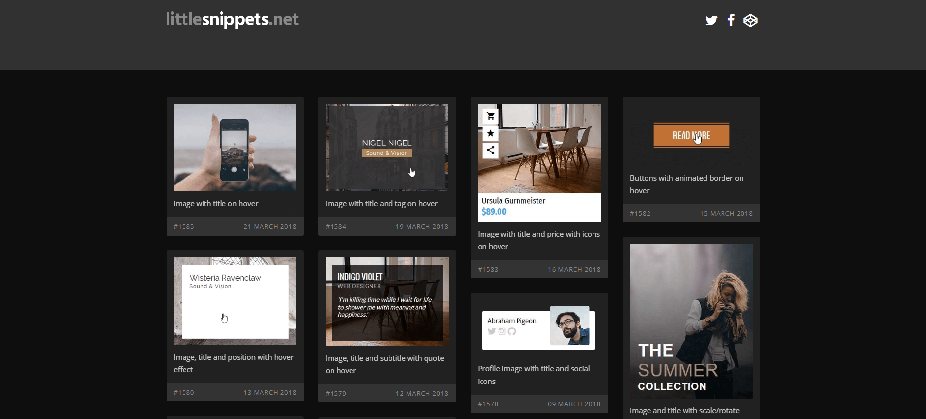 Little Snippets는 웹 디자인 및 개발에 일반적으로 사용되는 다양한 구성 요소를 집계하는 웹 사이트입니다. 섹션을 여러 개의 작은 섹션으로 나누면 원하는 코드 조각을 더 쉽게 찾을 수 있습니다. 또한 웹 디자인에서 일반적으로 사용되는 새로운 코드 조각 및 라이브러리에 대한 자습서를 제공하거나 소개합니다.