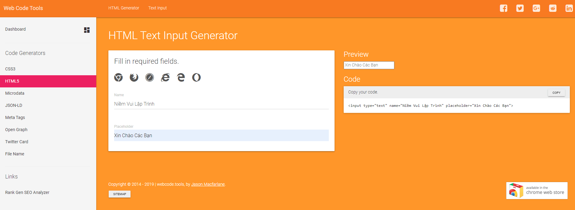 웹 코드 도구 는 입력한 속성을 통해 자동으로 코드를 생성할 수 있는 도구가 포함된 웹사이트입니다. 예를 들어 입력 문자를 만들어야 할 때 속성 입력을 Name및 로 제공합니다 Placeholder. 요소가 웹 페이지에 표시되기 전에 표시되고 자동으로 코드를 내보냅니다. 복사하여 프로젝트 웹에 붙여넣기만 하면 됩니다. 웹 코드 엔진은 HTML5, CSS3, Microdata, 메타 태그에 대한 많은 기능을 지원합니다.
