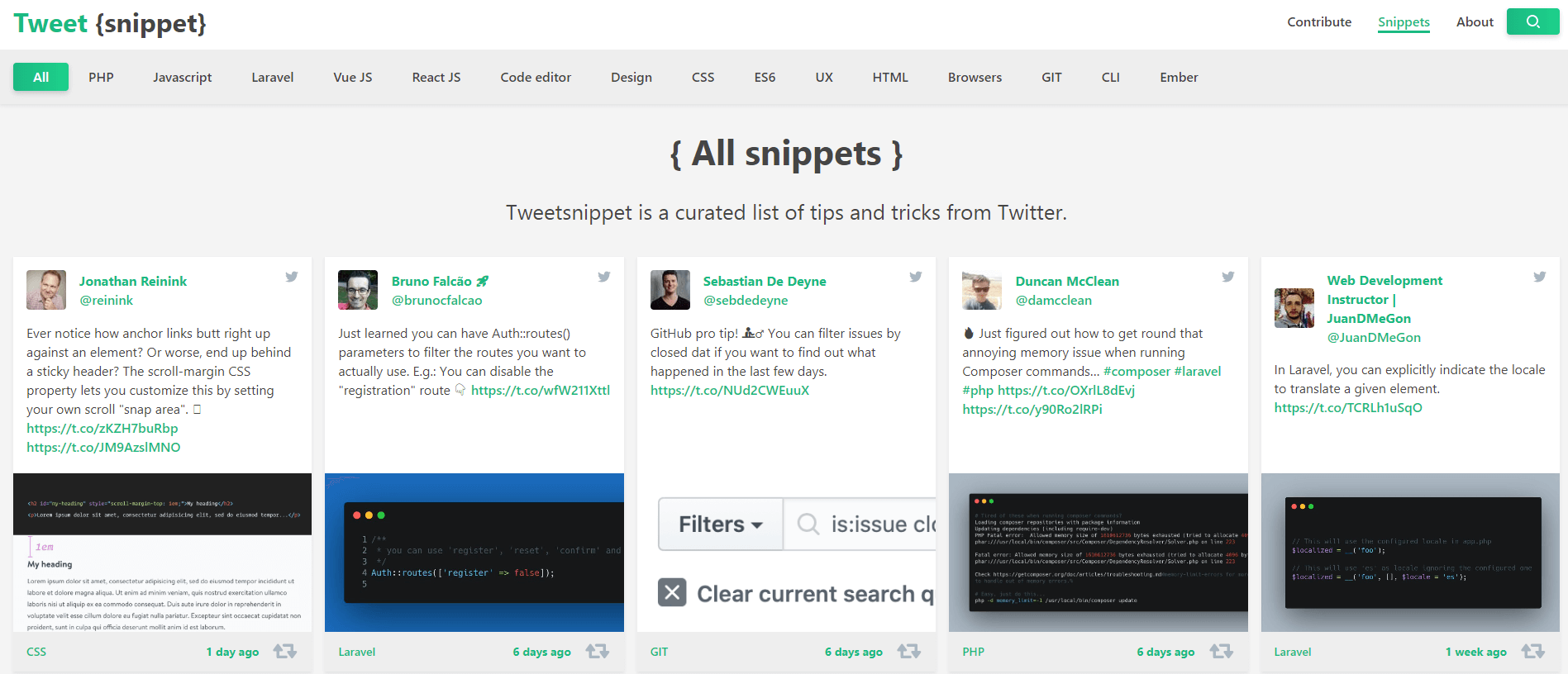Tweetsnippet 은 코드 조각, 작은 팁 또는 지침 기사 합성을 전문으로 하는 웹사이트입니다. 소셜 네트워크 Twitter에 게시된 프로그래밍 언어에 대한 심층 자습서. 정기적으로 업데이트되는 경우가 많으며 각 업데이트의 시간은 약 3~4일입니다. Tweetsnippet은 Javascript, PHP, HTML, CSS, Vue JS와 같은 오늘날의 인기 있는 많은 언어도 지원합니다. 제 생각에는 이것이 우리가 있는 곳입니다. 지식을 향상시키고 프로그래밍 작업에 적용하기 위해 훌륭한 프로그래머로부터 많은 흥미로운 것들을 배울 수 있습니다.