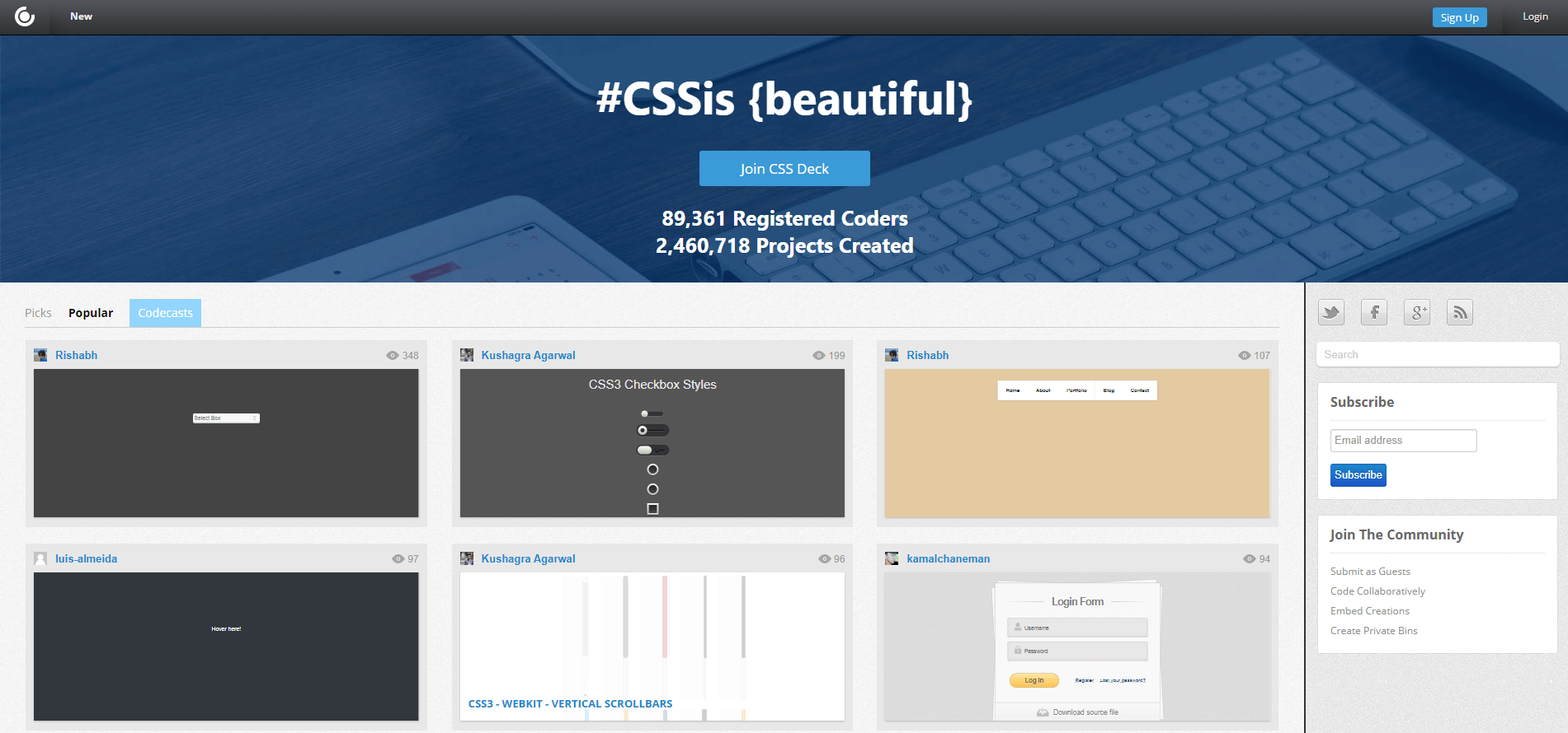 CSSdeck은 HTML, CSS 및 Javascript에 대한 코드 조각 합성을 전문으로 하는 웹사이트입니다. 여기에서 CSS로 디자인된 흥미롭고 창의적인 프로그램을 찾을 수 있습니다. 또한 지식과 프로그램을 커뮤니티와 공유하거나 프로그래밍 과정에서 궁금한 점에 대해 질문할 수 있는 포럼도 있습니다.