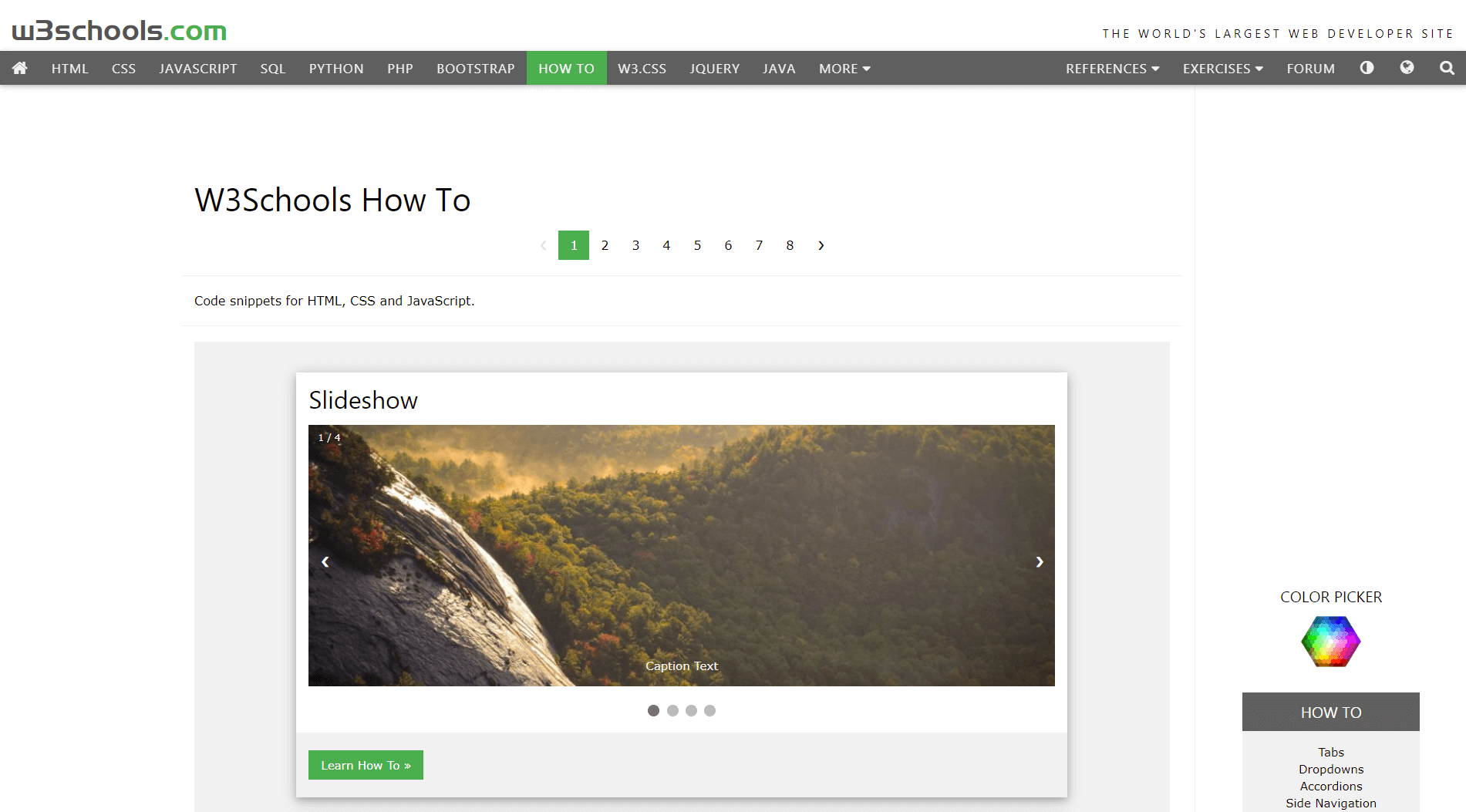 W3Schools는 프론트엔드 또는 백엔드를 전문으로 하는 프로그래머에게 매우 유용한 과정을 제공하는 웹사이트입니다. 프로그래밍과 웹 개발에 필요한 모든 지식을 배우는 데 도움이 됩니다. 그러나 내가 아는 한 W3Schools에는 프로그래밍의 일반적인 문제 또는 구성 요소에 대한 코드 조각을 합성하는 전문 페이지가 있으며 HTML, CSS 및 Javascript의 3가지 주요 언어를 지원합니다.